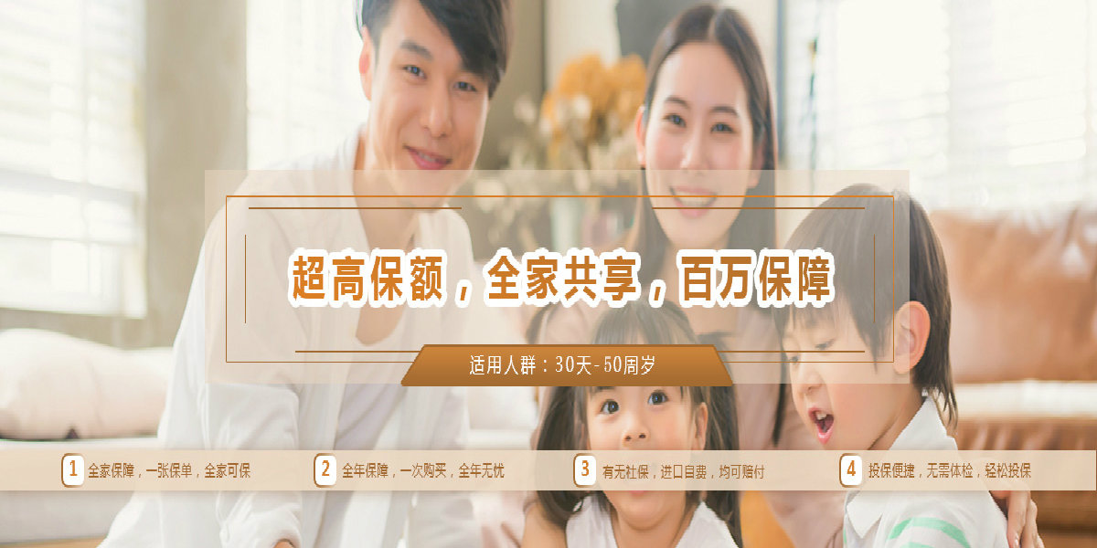一张保单,全家可保;全家共享,百万保障;进口自费,均可赔付;发生赔付, 亦可续保;个人独享,百万保障。